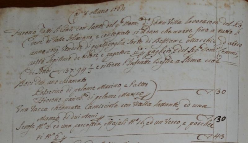 Immagine dei conti della Famiglia Lemmi del podere Valle Solomino, nel documento segnata come Valle Solimano, in Montegabbione con Sante diglio del fu Domenico detto Gatta Villa. 8 marzo 1762.