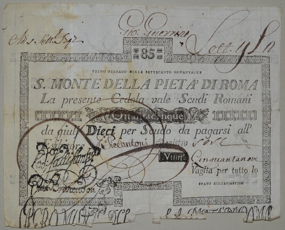 Cedola del Sacro Monte della Pietà di Roma da 85 scudi emessa il 1 febbraio 1792.