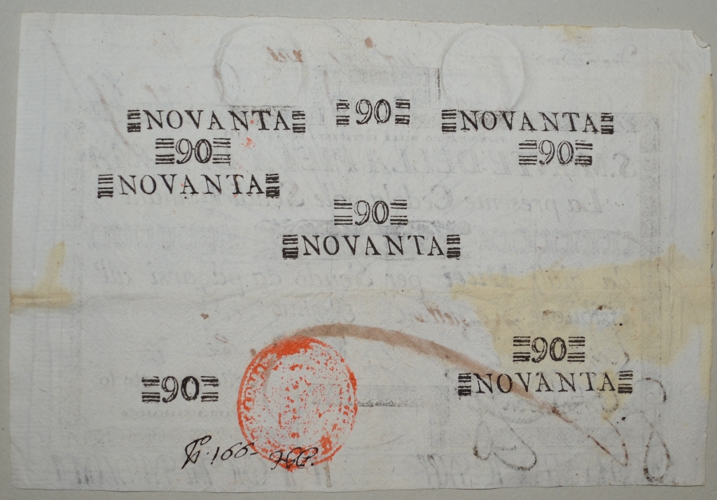 Cedola del Sacro Monte della Pietà di Roma da 90 scudi emessa il 1 maggio 1797 con il raro bollo repubblicano della Municipalità di Monteleone.