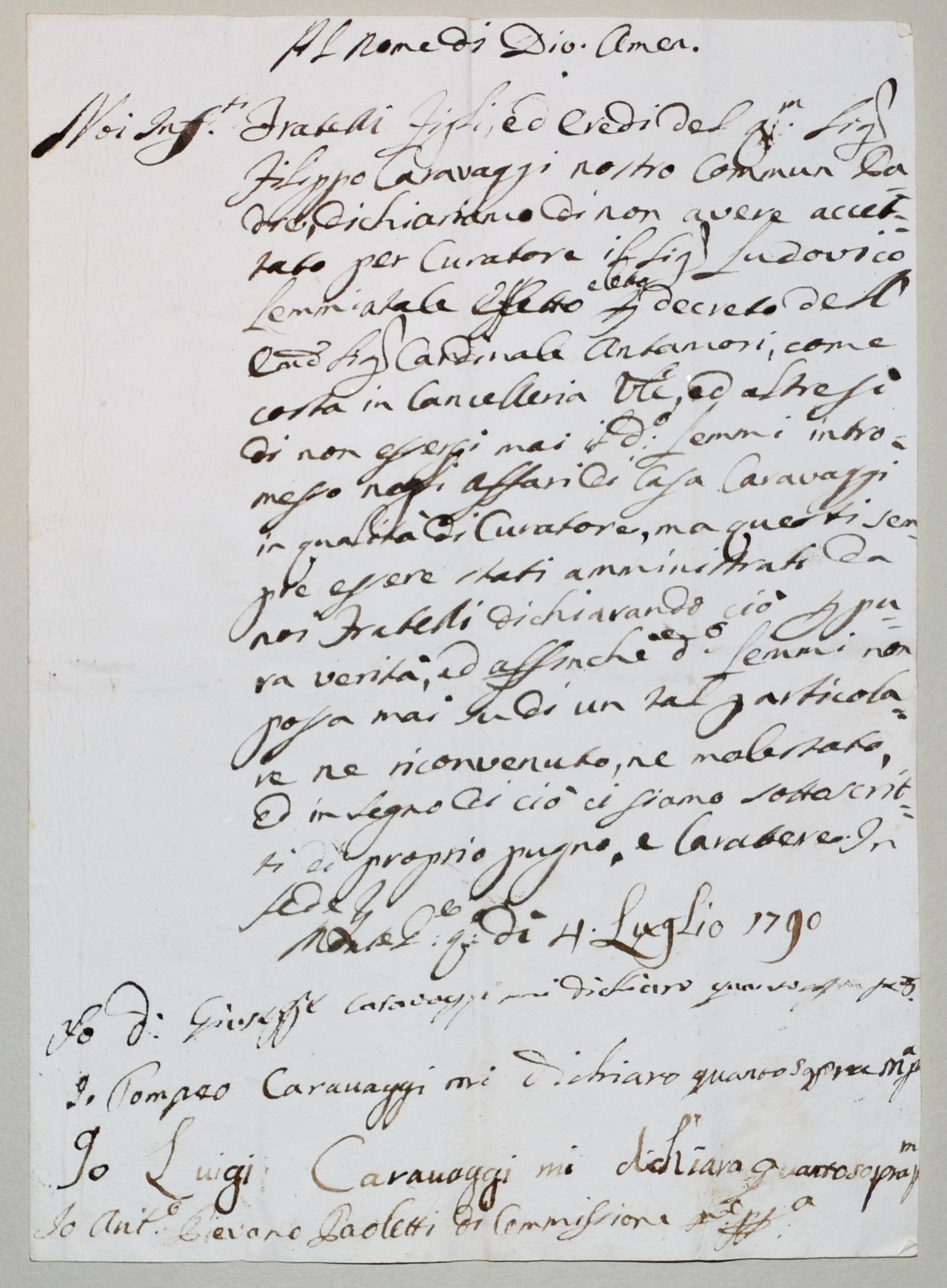 | 1790.07.04 - Montegabbione - Dichiarazione che i fratelli Caravaggi non accettano come curatore Ludovico Lemmi |