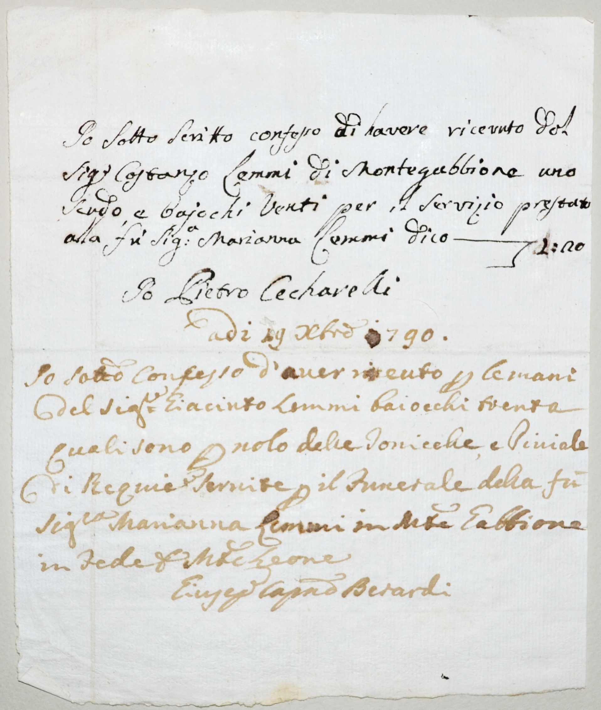 | 1790.10.19 - Montegabbione - Ricevuta da Pietro cecharelli a Costanzo Lemmi |