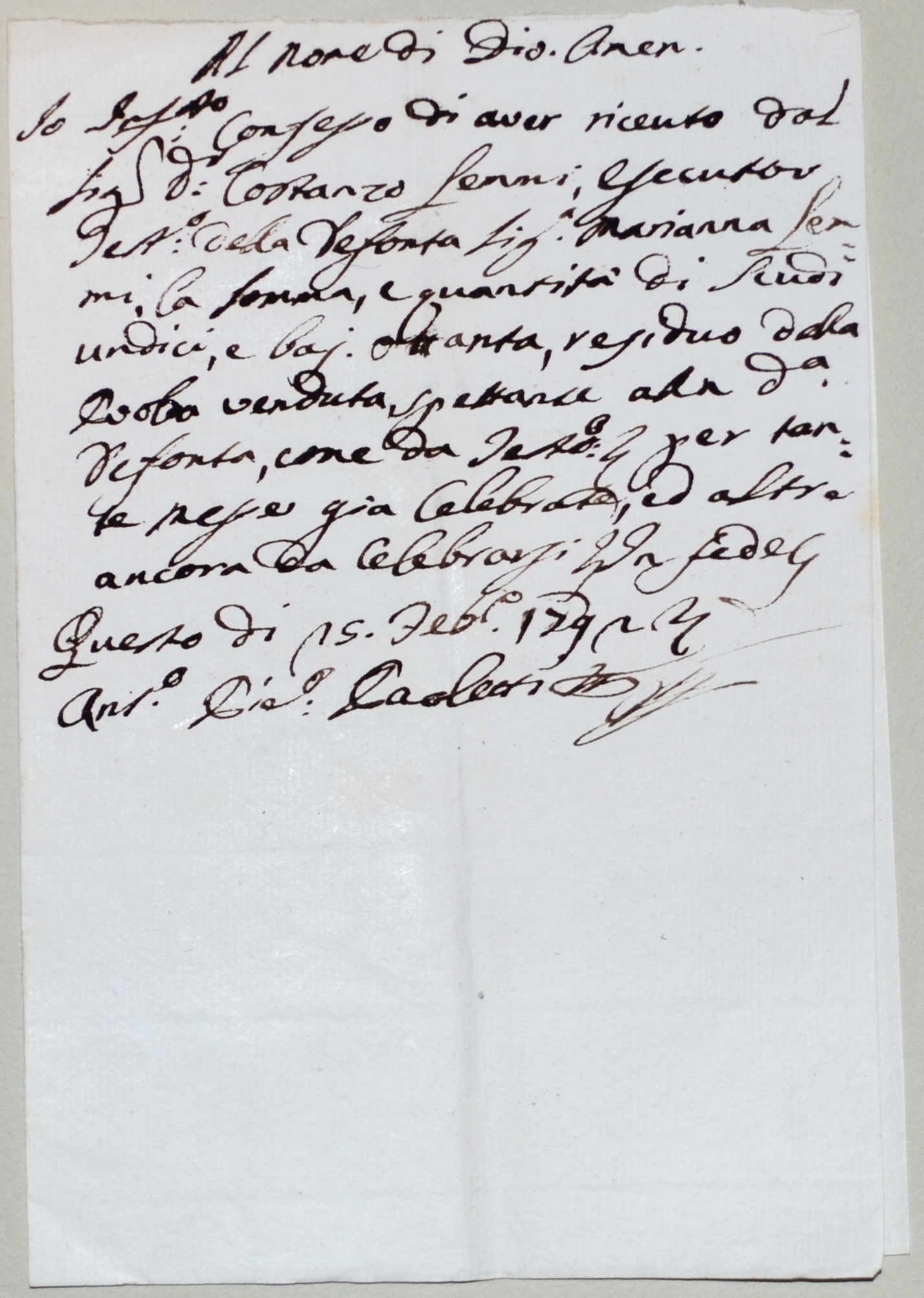 | 1792.02.16 - Ricevuta di Giuseppe Caravaggi a Costanzo Lemmi per scudi dieci |