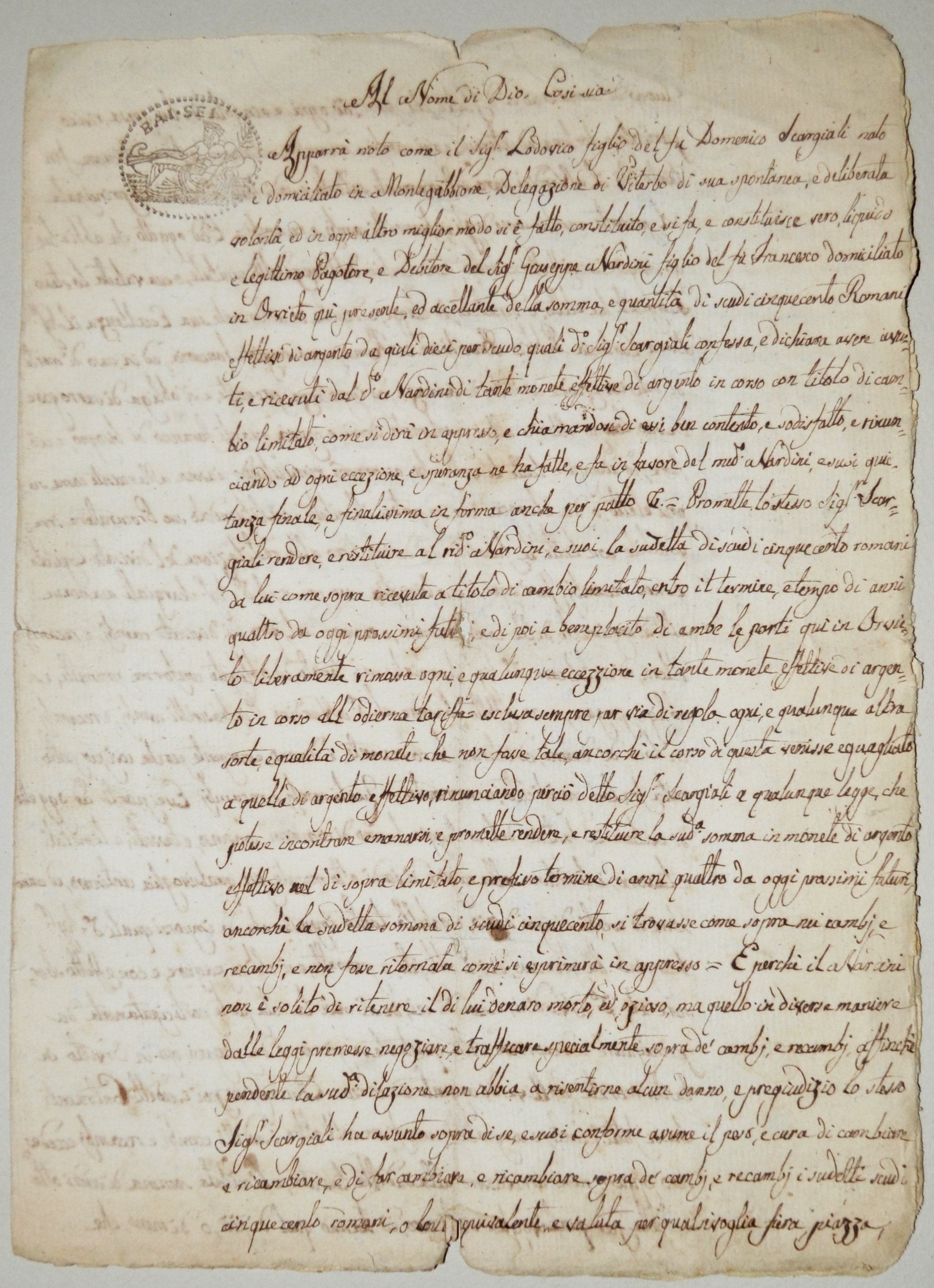 | 1823.10.03 - Montegabbione - Debito Domenico Scargiali a Giuseppe Nardini di Scudi cinquecento Romani |