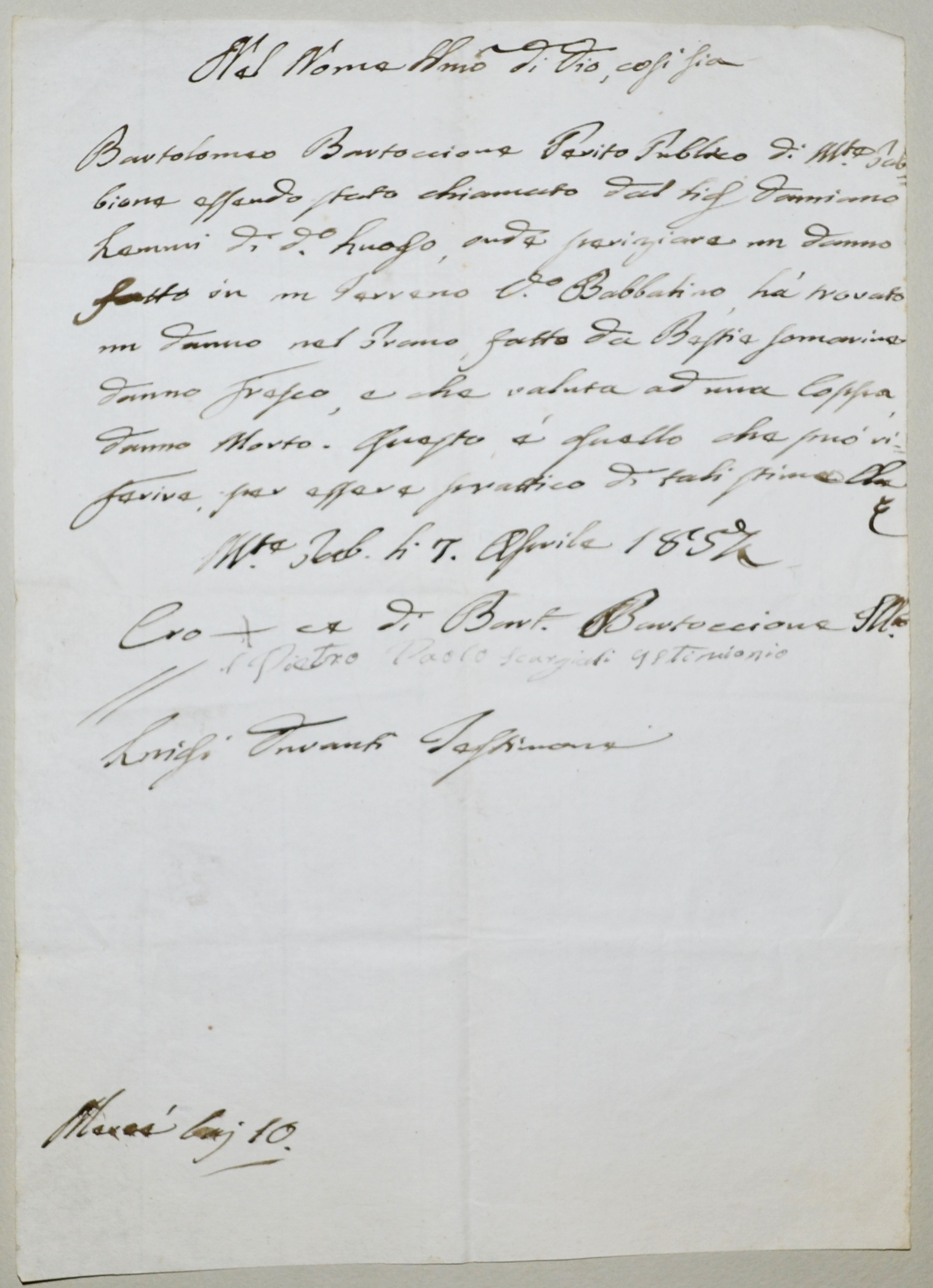 | 1857.04.07 - Montegabbione - Perizia di Bartolomeo Bartoccione chiamato da Damialo Lemmi per danno al grano di vocabolo Babbatino da bestie somarine |