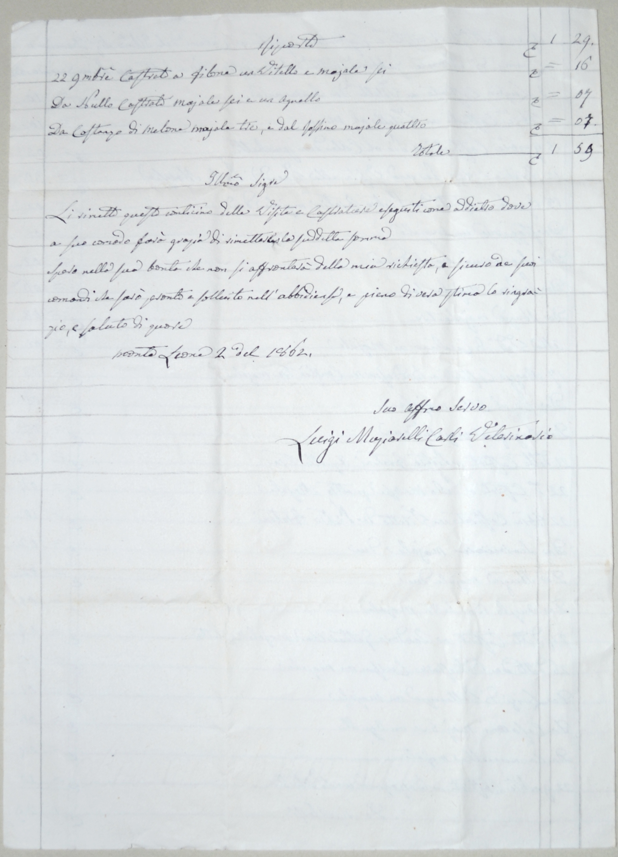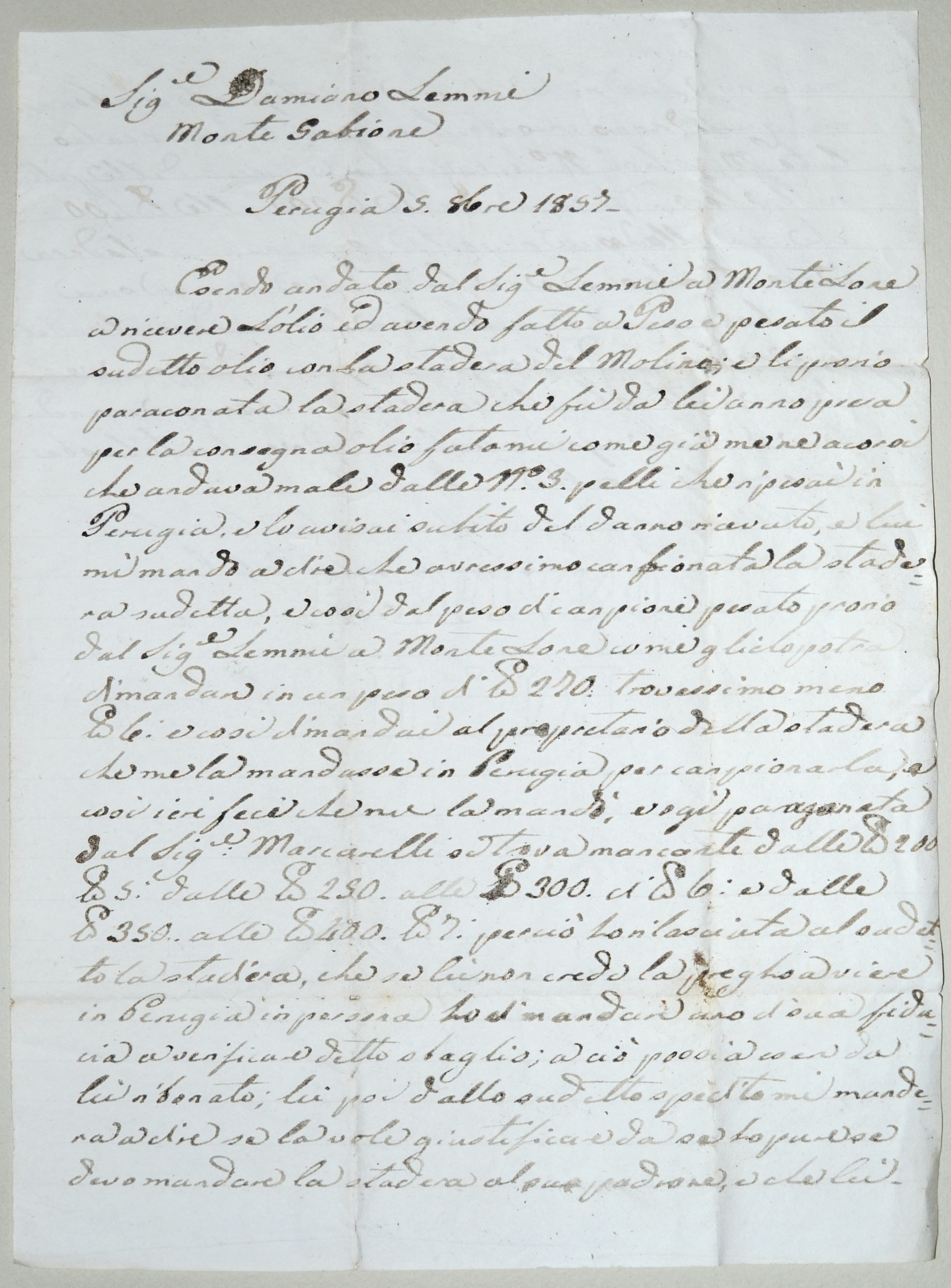 | 1857.10.05 - Perugia - Lettera da Arcangelo Calabri a Damiano Lemmi per questioni di olio |