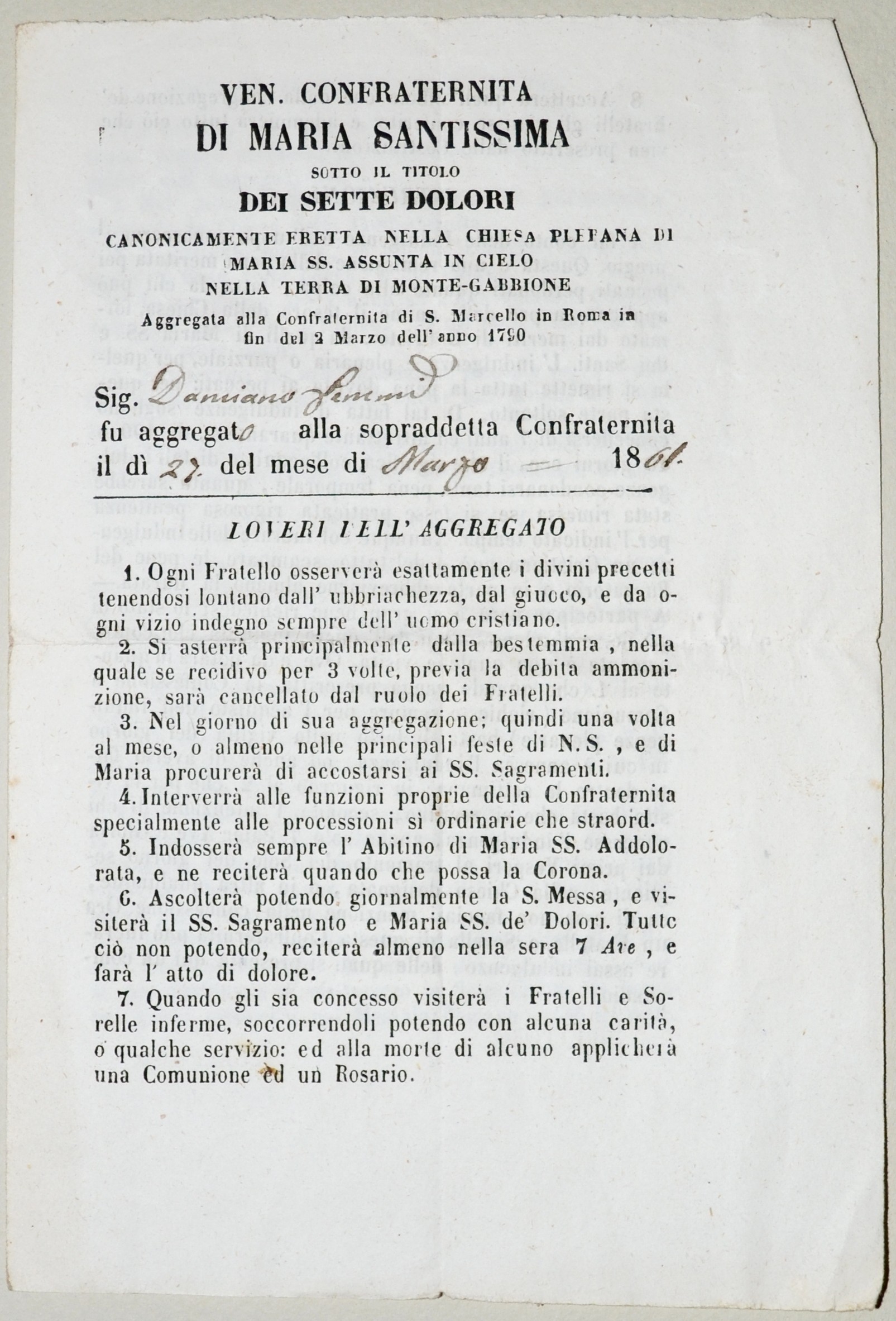 | 1861.03.27 - Montegabbione - Aggregazione di Damiano Lemmi alla Confraternita di Mria Santissima sotto il titolo dei Setti Dolori |