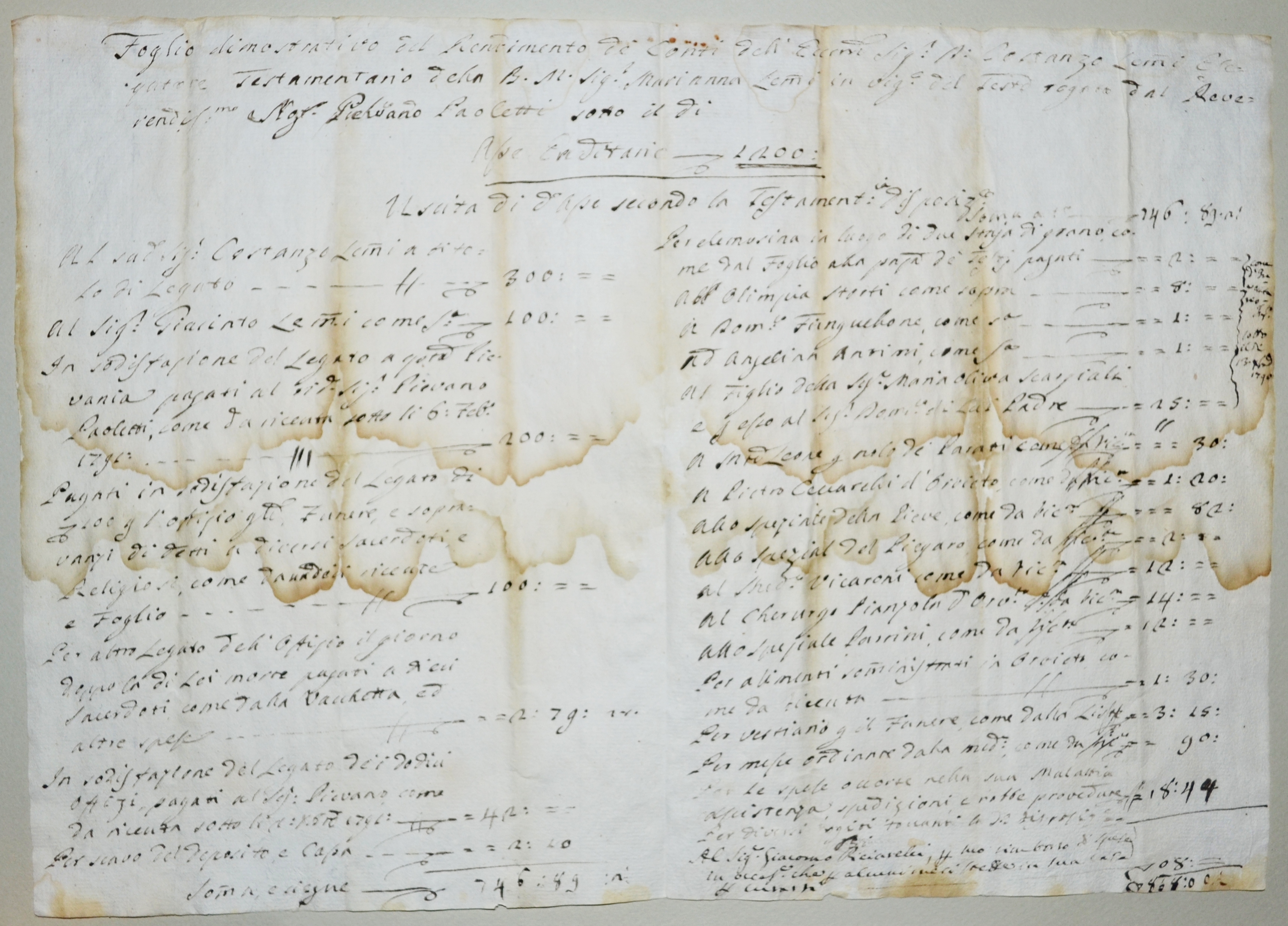 | Foglio dimostrativo del rendimento dei conti di Costanzo Lemmi esecutore testamentario di Marianna Lemmi |